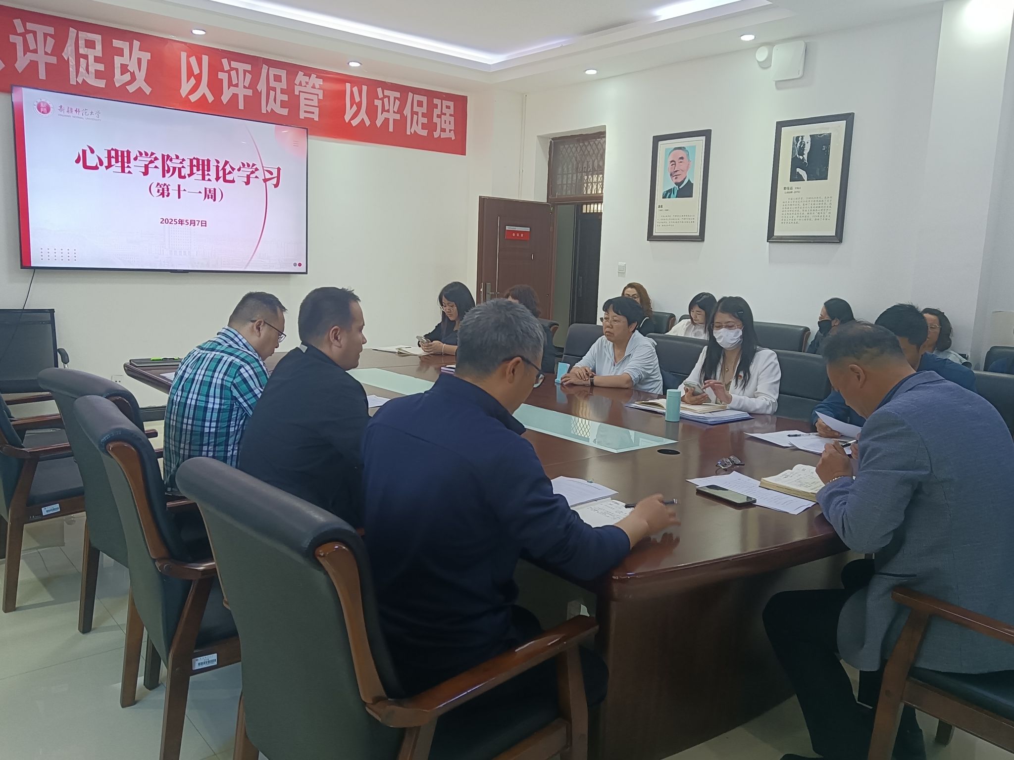 为深入贯彻习近平总书记重要讲话重要指示精神,落实《中共中央 国务院关于弘扬教育家精神 加强新时代高素质专业化教师队伍建设的意见》,强化教师政治理论学习,促进理论与业务融合,心理学院于 2025 年 5 月 7 日(周三)下午组织了教职工政治理论学习活动。本次学习采用了集中学习、自主学习及小组研讨等多种形式。教师们认真聆听讲解,做好笔记;自主学习过程中,大家深入思考,结合自身工作实际进行分析;小组研讨环节教师们各抒己见,分享学习心得和体会,。