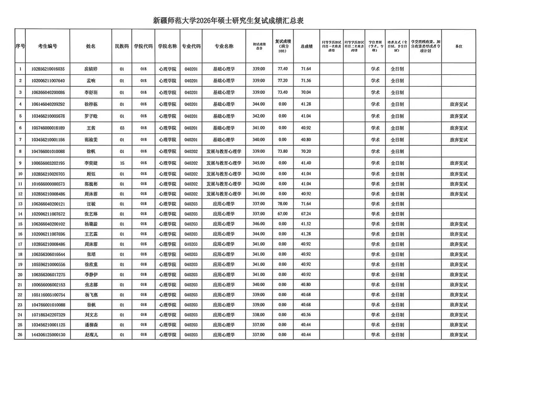 新疆师范大学心理学院2026年硕士研究生招生考试一批次调剂基础心理学、发展与教育心理学、应用心理学专业复试工作已全部结束,现将成绩予以公示。如有异议,请联系学院研究生招生办公室。